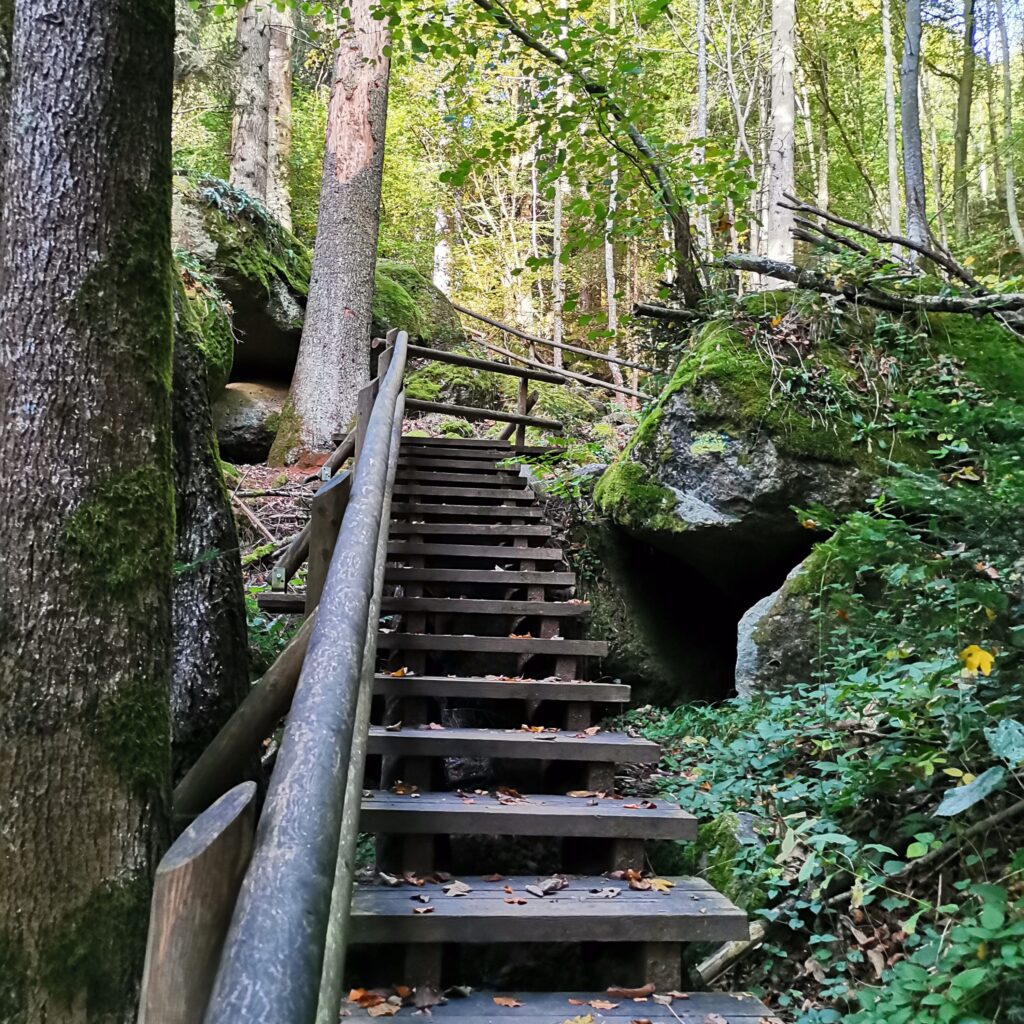 Wir steigen durch die bekannte Ysperklamm zahlreiche Treppen 2 km nach oben in die Stille des Weinsbergerwaldes, wandern weiter am Druidenweg vorbei an geheimnisvollen Steinformationen keltischer Kultstätten.